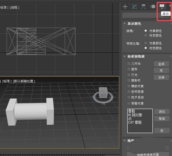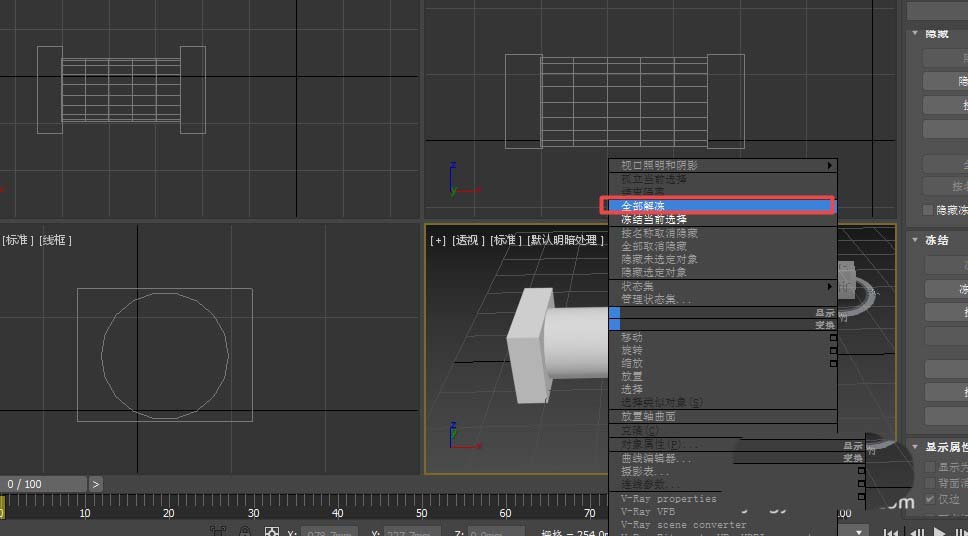 5、如果只想解凍某一個(gè)物體如中間的圓柱體。則找到顯示面板。