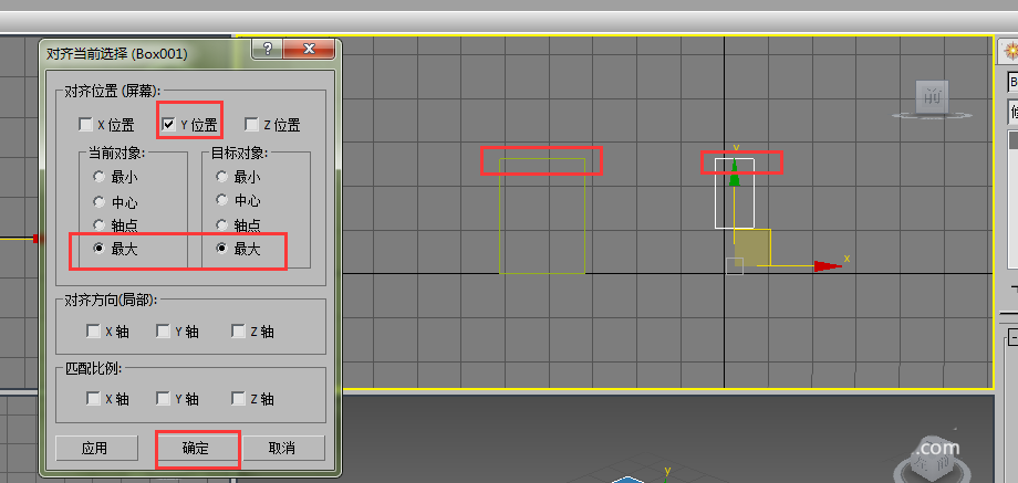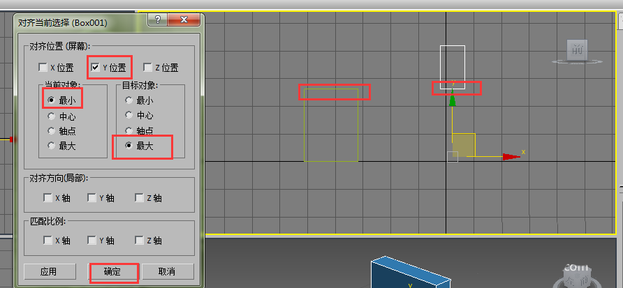 5、我們在對話框中選擇Y位置,當前對象選擇最小,目標對象選擇最大,確定,這樣右側長方體的下邊和左側長方體的上邊就對齊了,如圖所示。
