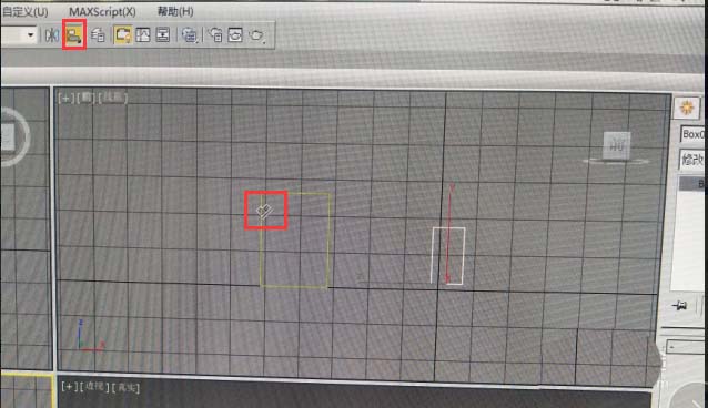 3、首先,我們點擊選擇右側的長方體,然后點擊對齊按扭,如圖所示。當把鼠標放到目標物體(即要做為參考的物體)上時,鼠標會變成兩個小矩形狀,如圖所示。