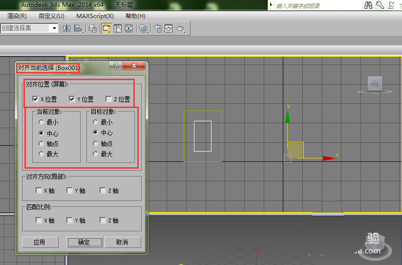 4、這時點擊目標物體后,會彈出一個對齊對話框。如圖所示,這個對話框分中我們主要用到紅框中“對齊位置(屏幕)”部分,這里給大家介紹一下它們的意思,“X、Y、Z位置”代表在哪個軸上進行移動對齊,”最大“代表坐標的右側和上方,最小代表坐標的左側和下方,中心代表物體的絕對中心,軸點代表XY軸的交點位置。