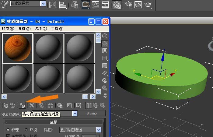 7、選擇立體圓形,單擊【將材質賦予指定對象】的按鈕。然后,選擇立體圓形,單擊【將材質賦予指定對象】的按鈕,這樣就可以把木紋材質貼到立體圓形上了,如下圖所示。