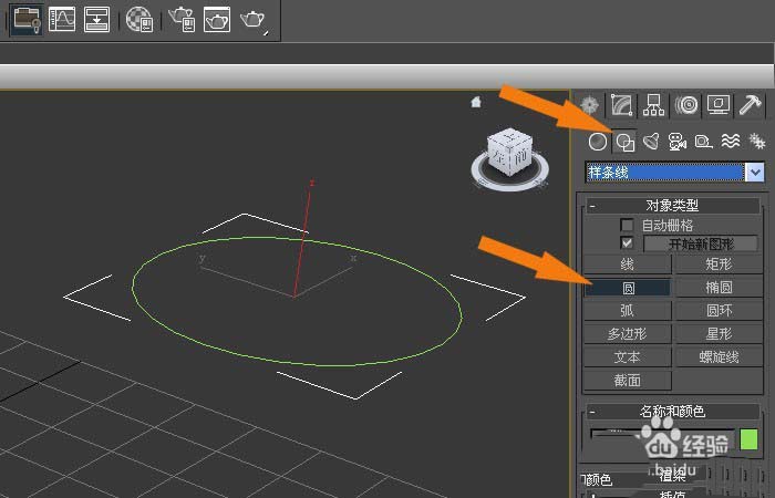 1、在窗口的右邊,鼠標左鍵單擊圖形面板的【圓】按鈕。打開3d max軟件(這里用的3d max2010版的軟件)。可看到四個視圖窗口,在窗口的右邊,鼠標左鍵單擊圖形面板的【圓】按鈕,在透視圖中創建一個圓形出來,如下圖所示。