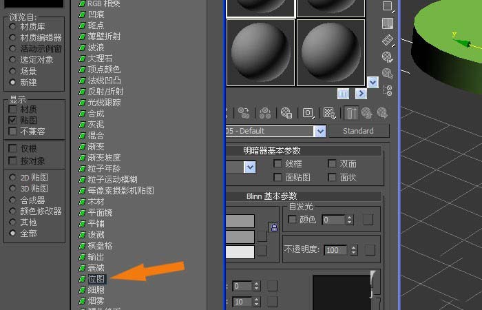 6、在彈出的【材質瀏覽器】中選擇【位圖】。接著,鼠標左鍵在彈出的【材質瀏覽器】中選擇【位圖】,如下圖所示。