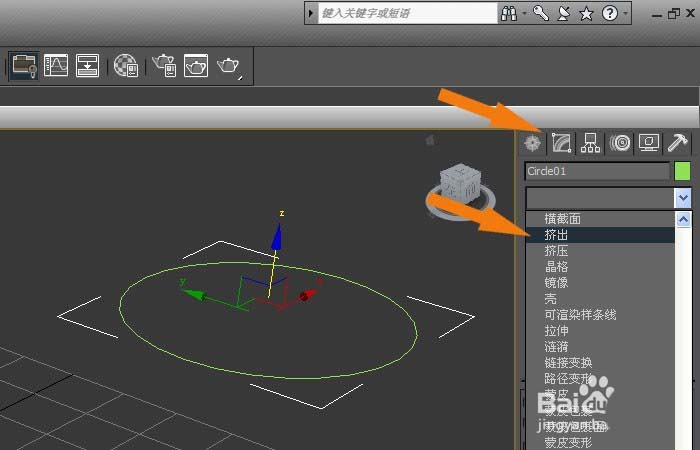 2、鼠標左鍵單擊修改面板,選擇【擠出】命令。接著, 鼠標左鍵單擊修改面板,選擇【擠出】命令,如下圖所示。