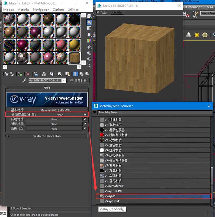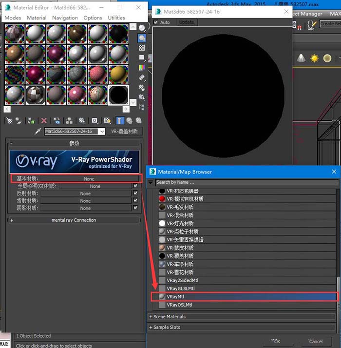 1、首先,打開3d max軟件,按“M”鍵調出“材質設置面板”,選擇一個空白的材質球。點擊“標準”按鈕,在彈出的對話框中選擇“vray覆蓋材質”。