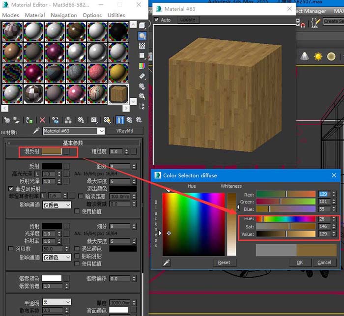 4、向上返回到“vray包裹材質”界面,進入“GI材質”子層級,選擇“vray材質”,將“漫反射”值設置為接近木地板材質貼圖的顏色,如(R129,G101,B55)。