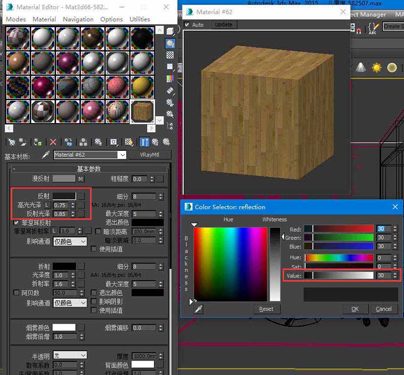 3、設置“反射”值為30,“高光光澤度”設置為0.75,“反射光澤度”為0.85。