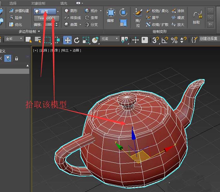 2、打開石墨建模工具,切換到自由形式選項卡,切換到繪制于:曲面,點擊拾取按鈕,拾取該茶壺模型。