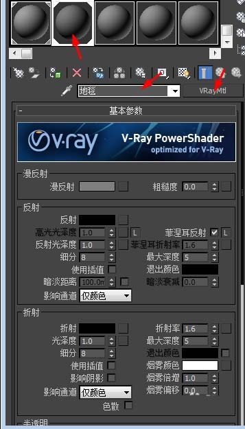 4、為切角長方體添加材質,將默認的材質改為V-Ray標準材質,并命名為地毯