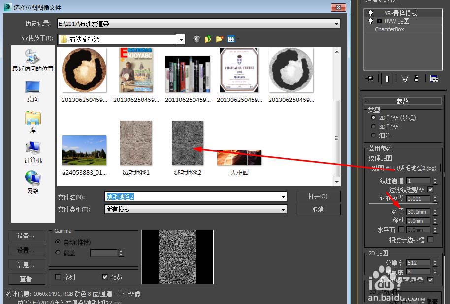 10、在文理貼圖選項添加一張灰色的毛絨地毯貼圖,數量為30