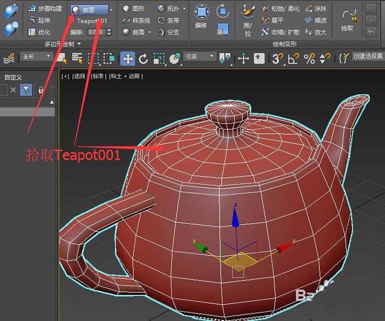 1、首先我們有一個茶壺模型(可編輯多邊形),作為稍后的被編輯曲面或者是目標曲面。