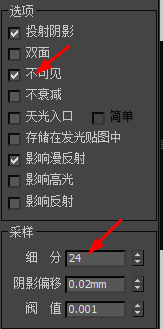 5、在燈光選項中勾選不可見,采樣細分修改為24,完成球體燈光創建