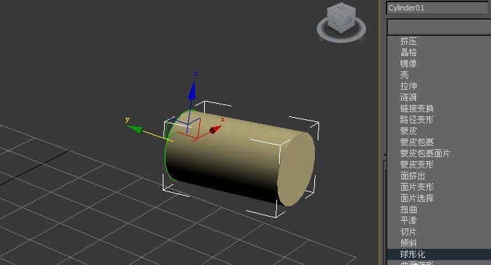 2、接著,鼠標(biāo)左鍵選擇【圓柱體】后,在右邊的【修改器】面板上,拖動(dòng)下拉選項(xiàng),選擇球形化命令,如下圖所示。
