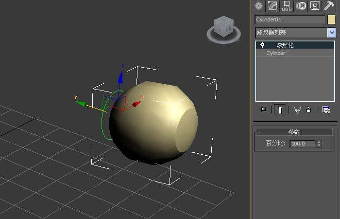 3、然后,在右邊的【球形化命令】面板上,可看到默認(rèn)百分比參數(shù)為100,此時(shí)在透視圖上,可看到圓柱體變成球形了。