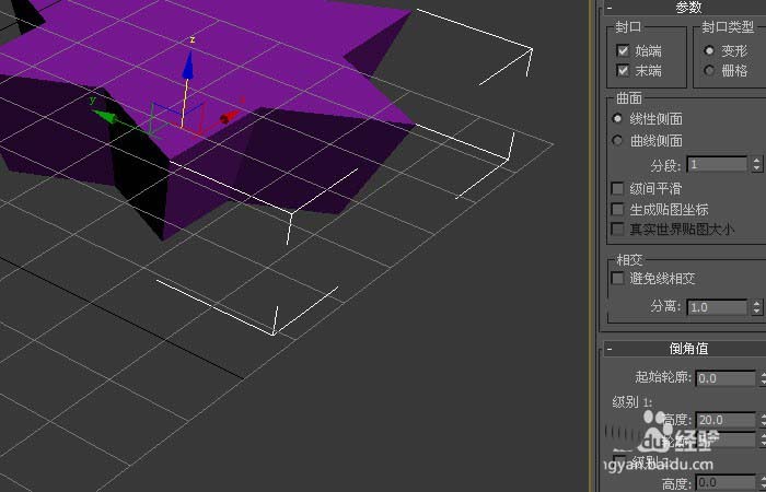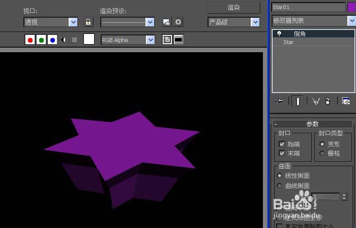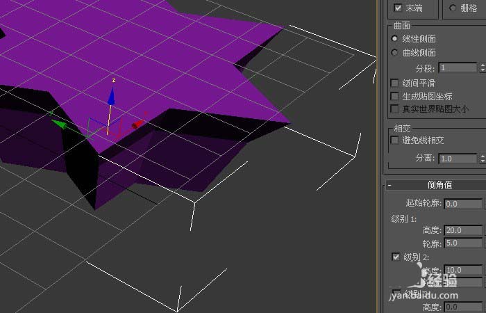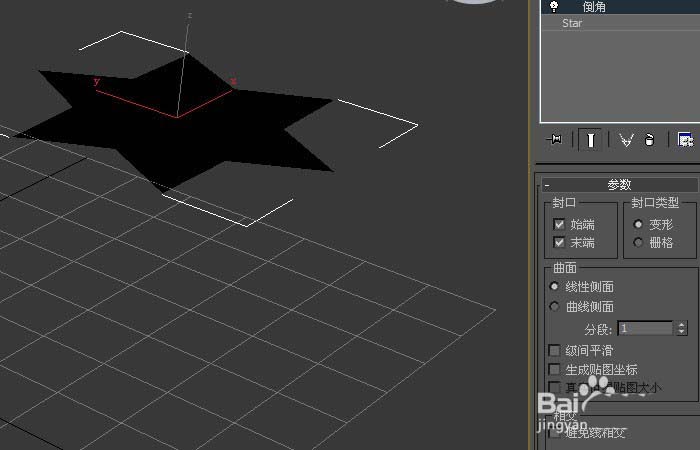 3、然后,在透視圖中,可看到星形圖形發(fā)生了改變,但并沒有出現(xiàn)倒角,這需要修改倒角面板上的參數(shù),如下圖所示。