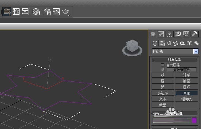 1、打開3d max軟件(這里用的3d max2010版的軟件)。可看到四個(gè)視圖窗口,在窗口的右邊,鼠標(biāo)左鍵單擊面板的【樣條線】按鈕,選擇【星形】,在透視圖上,拖動(dòng)繪制一個(gè)星形線條出來(lái),并更換顏色為粉紅色,如下圖所示。