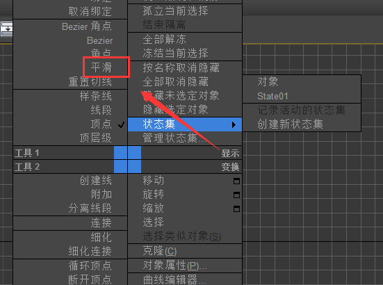 4、選擇線命令,在前視圖里繪制一條曲線,然后在修改里選擇點層級,選擇所有的點單擊鼠標(biāo)右鍵在彈出的右鍵菜單里找到平滑選項,如圖所示: