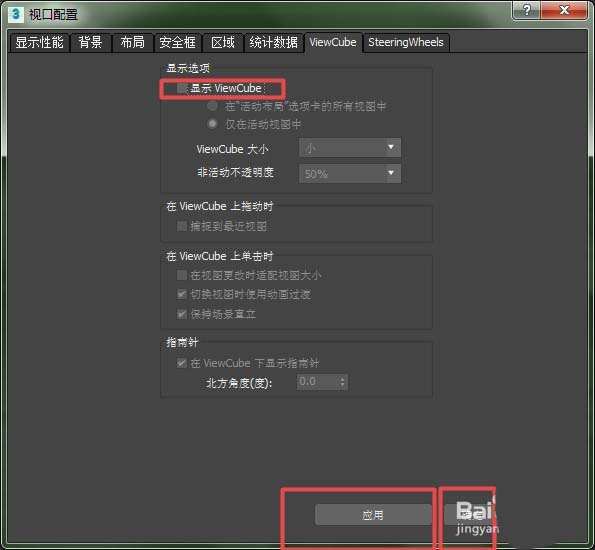 6、在“viewcube”在將“顯示viewcube”前的方框的√去掉即可。應用確定。