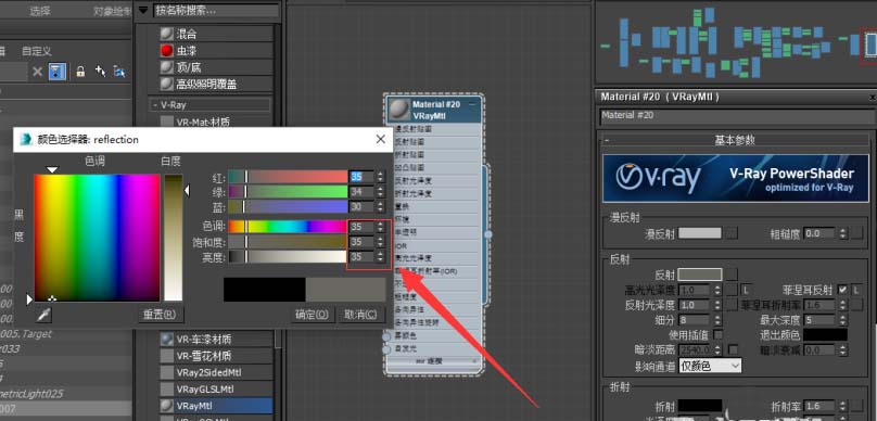2、雙擊反射后的顏色區域,進入“顏色選擇器”輸入色調“35”,飽和度“35”,亮度“35”,單擊確定;