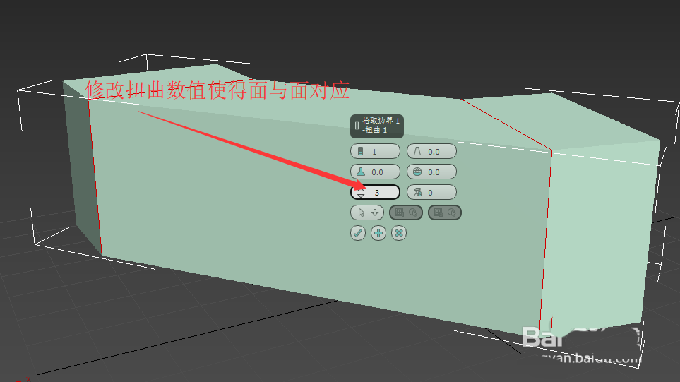 4、我們可以修改扭曲1或者扭曲2的數值(分別對應兩個邊界的偏移),來使得面與面對應成我們想要的樣子,如圖。