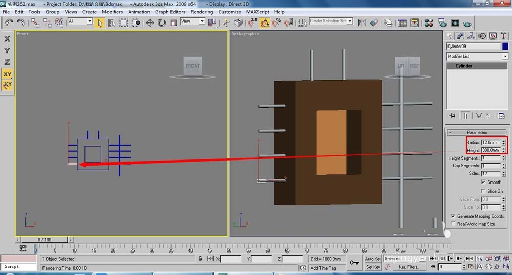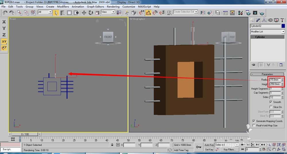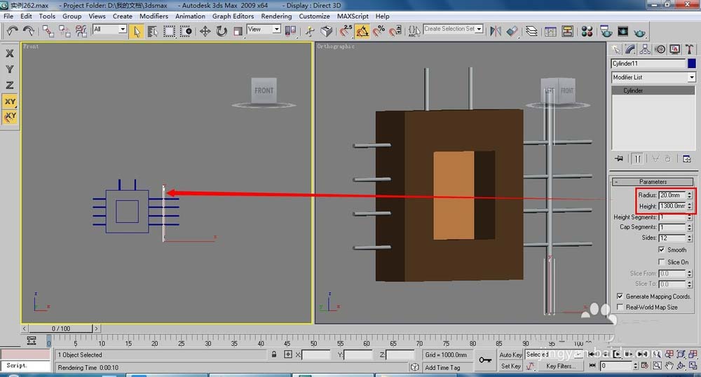 3、在視圖中圍繞方塊創(chuàng)建圓柱體,具體的位置和參數(shù)如下圖所示。