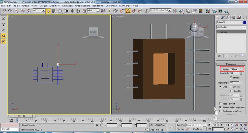 4、在頂視圖中創(chuàng)建半徑為75的球體,調(diào)整至合適位置,如下圖所示。