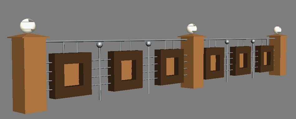 7、在頂視圖柱子的上面創(chuàng)建一個半徑為160的球體,在左視圖中創(chuàng)建半徑為20、高度為5000的圓柱體,調(diào)整至合適位置。我們也可以將制作完成的造型復制出多個,完成圍墻的制作,如下圖所示。