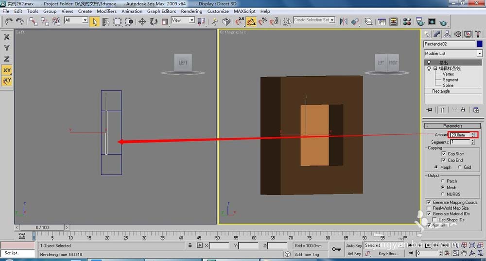 2、將制作的方塊在原位置復制一個,進入(樣條線)層級,刪除外面的樣條線,修改擠出數(shù)量為20,調(diào)整至透空方塊向內(nèi)的位置,如下圖所示。