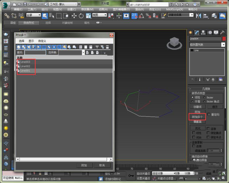 3、在右邊的修改面板下拉,找到附加。將幾條線附加在一起。這里用附加多個(gè),直接將另外三條線選擇。也可以用附加,然后在圖上一條一條線選擇,根據(jù)自己喜好和方便程度定。