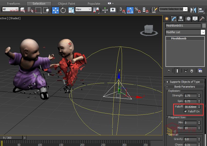 通過修改面板調(diào)整Bomb對象的衰減范圍以及強度值等參數(shù),得到一個自己滿意的效果.