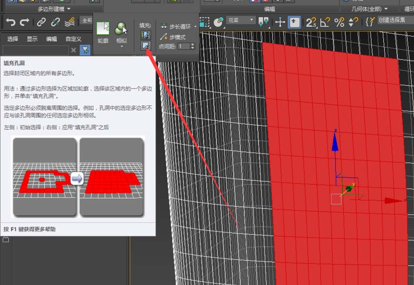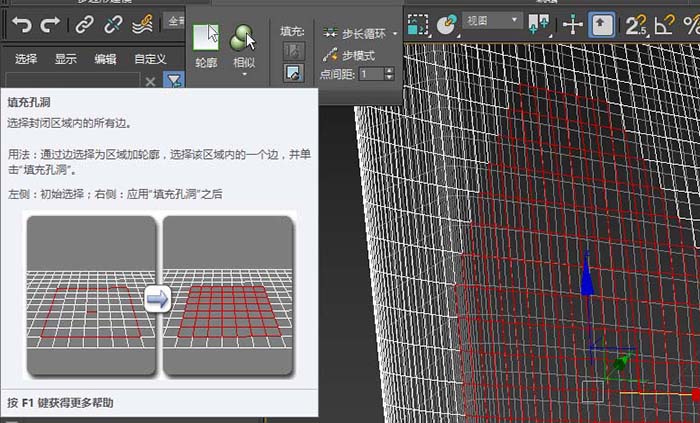 2、展開修改選擇面板,點擊填充孔洞按鈕,如圖,中間的面都被選中。