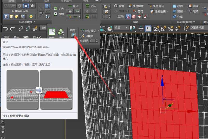 4、展開修改選擇面板,點擊填充按鈕,以連線為對角線的矩形內(nèi)的面元都被選中。