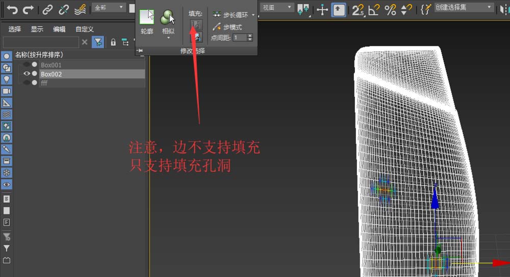 5、關(guān)于邊層級,只支持填充孔洞,不支持填充。如圖所示。