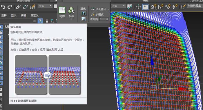 6、關(guān)于頂點層級,填充和填充孔洞都支持。但是在使用填充孔洞時,作為圍欄的頂點必須兩兩相鄰(兩兩在同一個邊上)。面元對角線上的兩個點被認為是不封閉的。