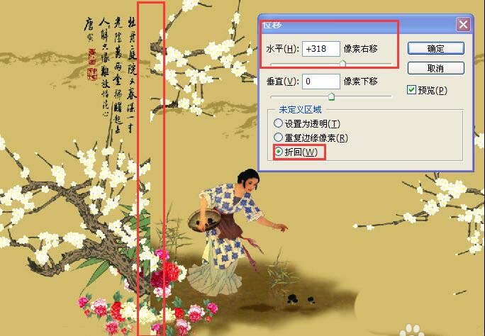 6、對復制的圖層執行“濾鏡”-----“其他”-----“位移”操作,在位移設置選項卡中首先點選“折回”選項,這個一定要。然后設置適量“水平位移”數值,圖形就會水平移動,就可以看到圖案的接縫了。如圖: