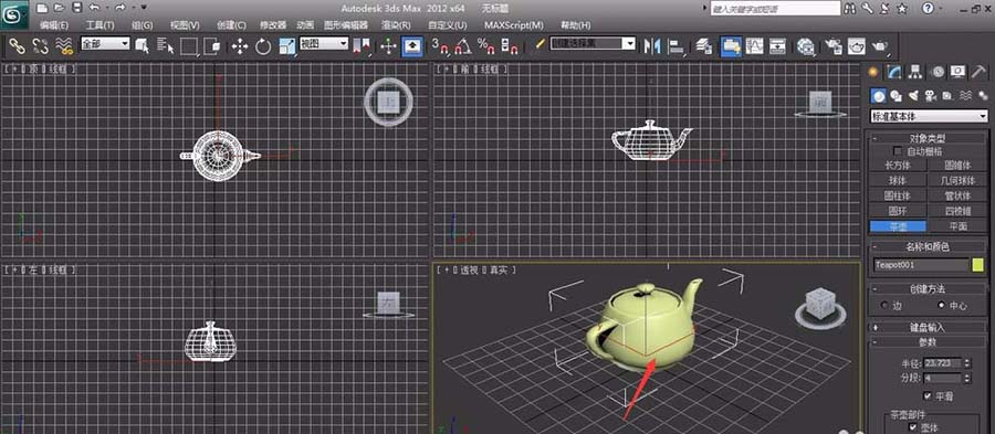 2、在視圖中按住鼠標左鍵并移動光標調整茶壺的大小,釋放鼠標即可創建茶壺,如圖所示。