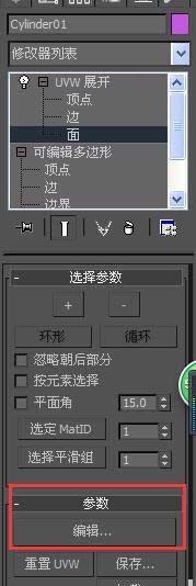 8、打開“uvw展開”修改器的子層級,點擊“面”。也就在面層級下操作。然后選擇在模型上選擇如圖所示的面。