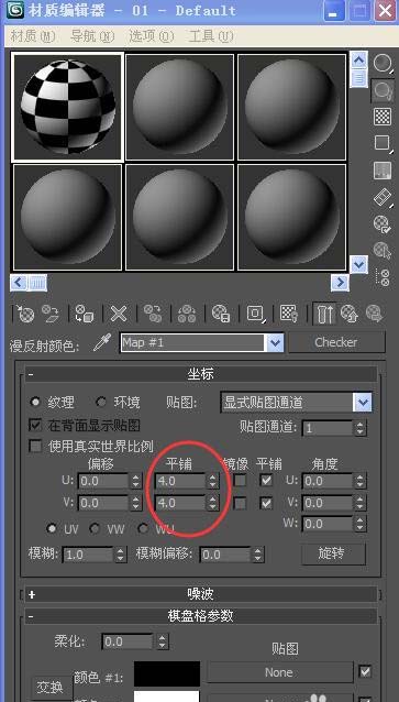 3、為漫反射指定一個“棋盤格”的程序貼圖,并設置參數如圖所示。