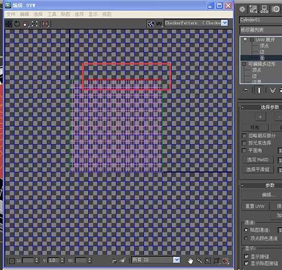 9、然后在“UVW展開”修改器操作面板中點擊“編輯”,從而打開如圖所示的“UVW展開”編輯面板,這里可以對模型指定面就行貼圖“uv”坐標的精細修改和調整。編輯面板中紅框標注,而且也是紅亮顯示的就是模型中相對應的面。而且你也可以看到棋盤格貼圖就是圖中的塊狀貼圖。