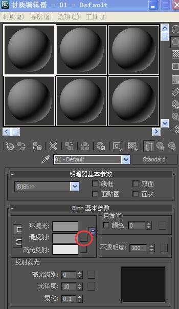 2、打開“材質編輯器”,選擇一個材質球。并點擊“漫反射”后的小方塊,打開它的滿發射貼圖通道。
