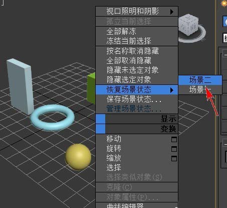 4、恢復場景狀態。右鍵單擊場景,在彈出的菜單中選擇“恢復場景狀態”。場景狀態便在視口中恢復。