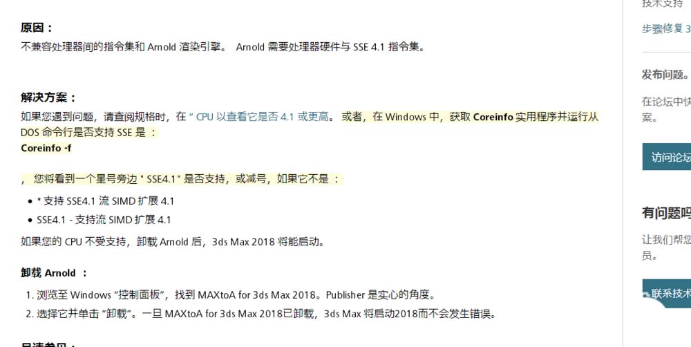 如果您遇到問題,請查閱規格時,在 “ CPU 以查看它是否 4.1 或更高。 或者,在 Windows 中,獲取 Coreinfo 實用程序并運行從 DOS 命令行是否支持 SSE 是 : Coreinfo -f , 您將看到一個星號旁邊 " SSE4.1" 是否支持,或減號,如果它不是 : * 支持 SSE4.1 流 SIMD 擴展 4.1SSE4.1 - 支持流 SIMD 擴展 4.1如果您的 CPU 不受支持,卸載 Arnold 后,3ds Max 2018 將能啟動。