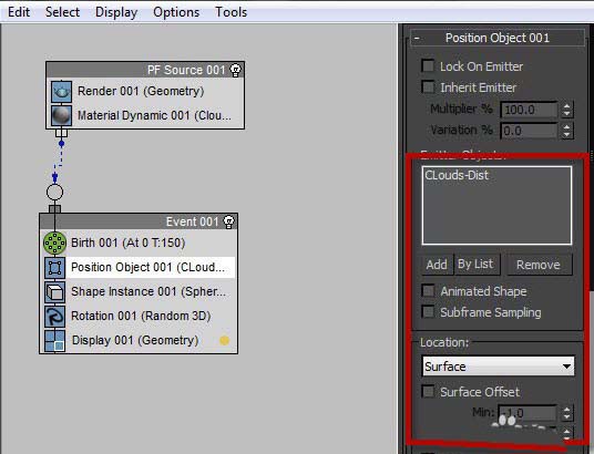7、通過單擊添加按鈕或添加列表按鈕創(chuàng)建位置對(duì)象和Pic Cloud-Dist。這樣,粒子將會(huì)在我們之前創(chuàng)建的面上產(chǎn)生。