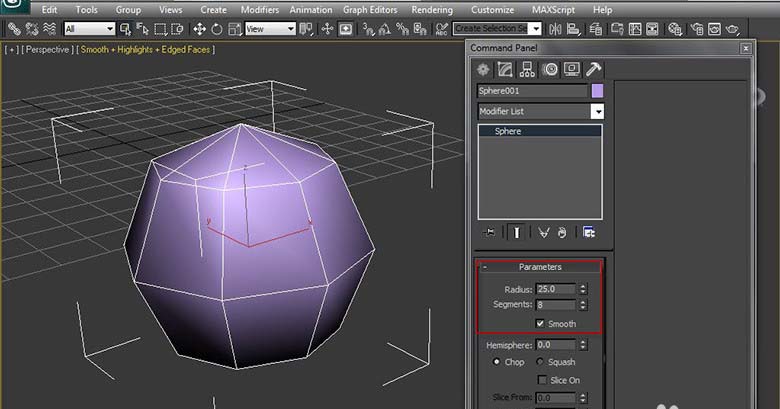 4、發(fā)射粒子的形狀,定義為球體比較合適,創(chuàng)建一個(gè)半徑為25段數(shù)為8的球體。