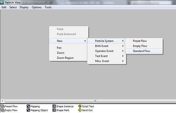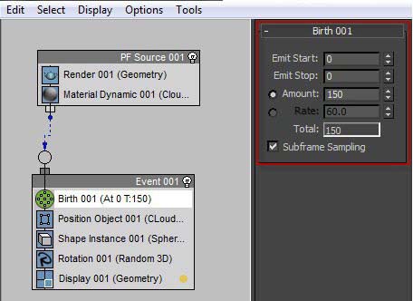 5、點(diǎn)擊鍵盤上的6鍵打開“粒子”視圖,并創(chuàng)建標(biāo)準(zhǔn)粒子流。使用PF在Cloud Dist上發(fā)射粒子。