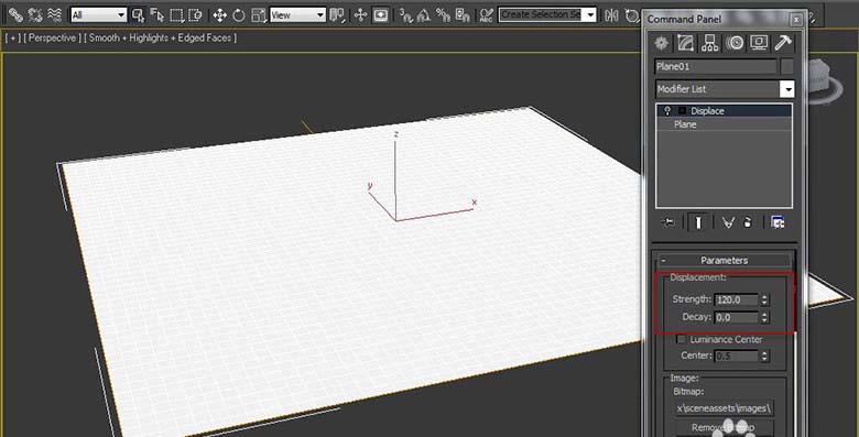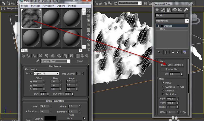 3、按M打開材質(zhì)編輯器,創(chuàng)建smoke,并將其命名為Displace Plne。將大小設(shè)置為74,迭代到20和指數(shù)0.9。