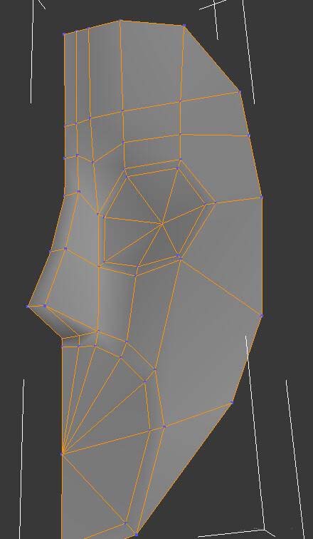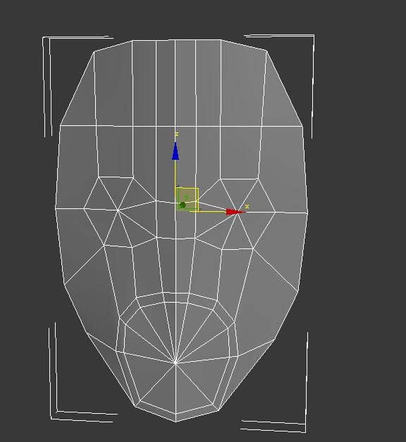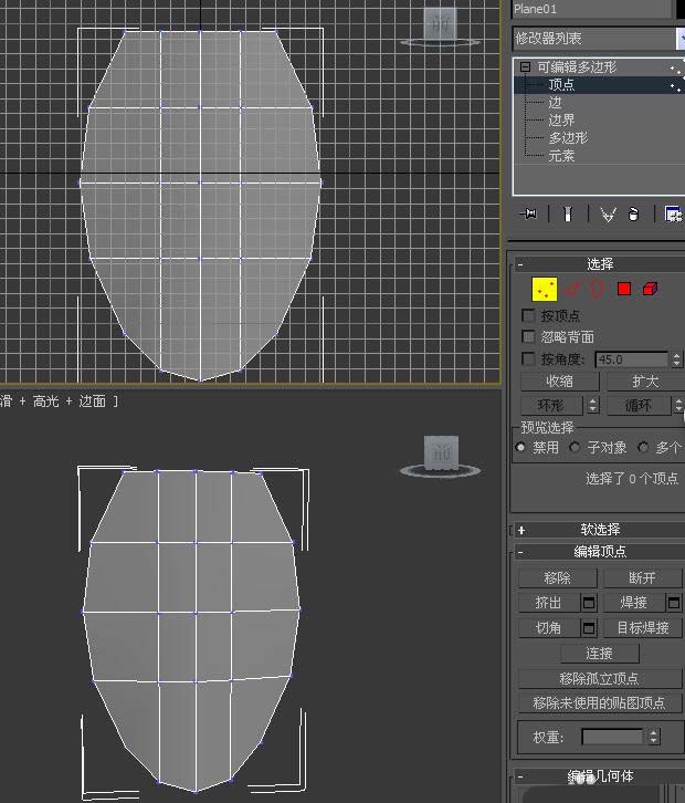 3、把平面物體“轉化為可編輯多邊形”,并調整頂點位置使之如人臉形狀。效果如圖。