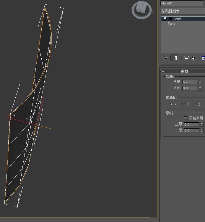 2、使用“彎曲”修改器對平面物體在X軸線上進行彎曲,以模擬臉部的彎曲圓滑形狀。