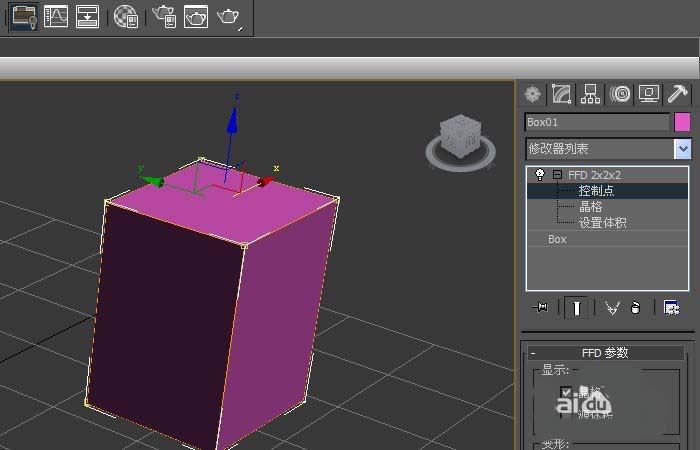 4、在【FFD】命令面板上,修改控制點2乘2參數,用鼠標將其向上拖動,此時可看到長方體發生改變,如下圖所示。