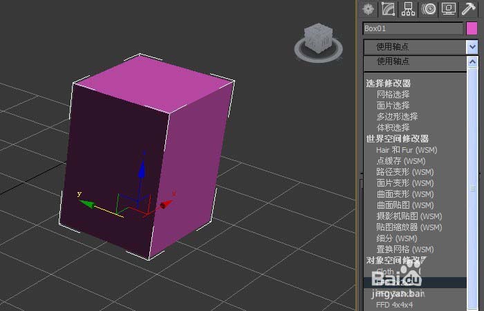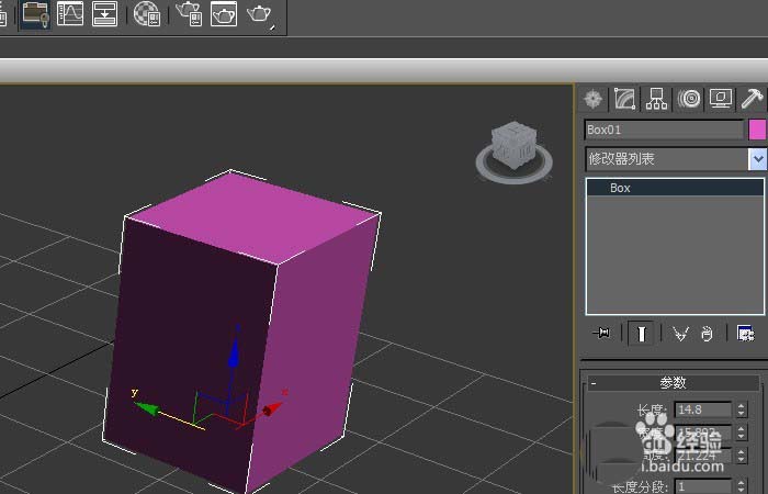2、鼠標左鍵單擊【修改】面板,可直接修改長方體,長、寬、高的參數值,修改后,在透視圖上的長方體就發生改變,如下圖所示。